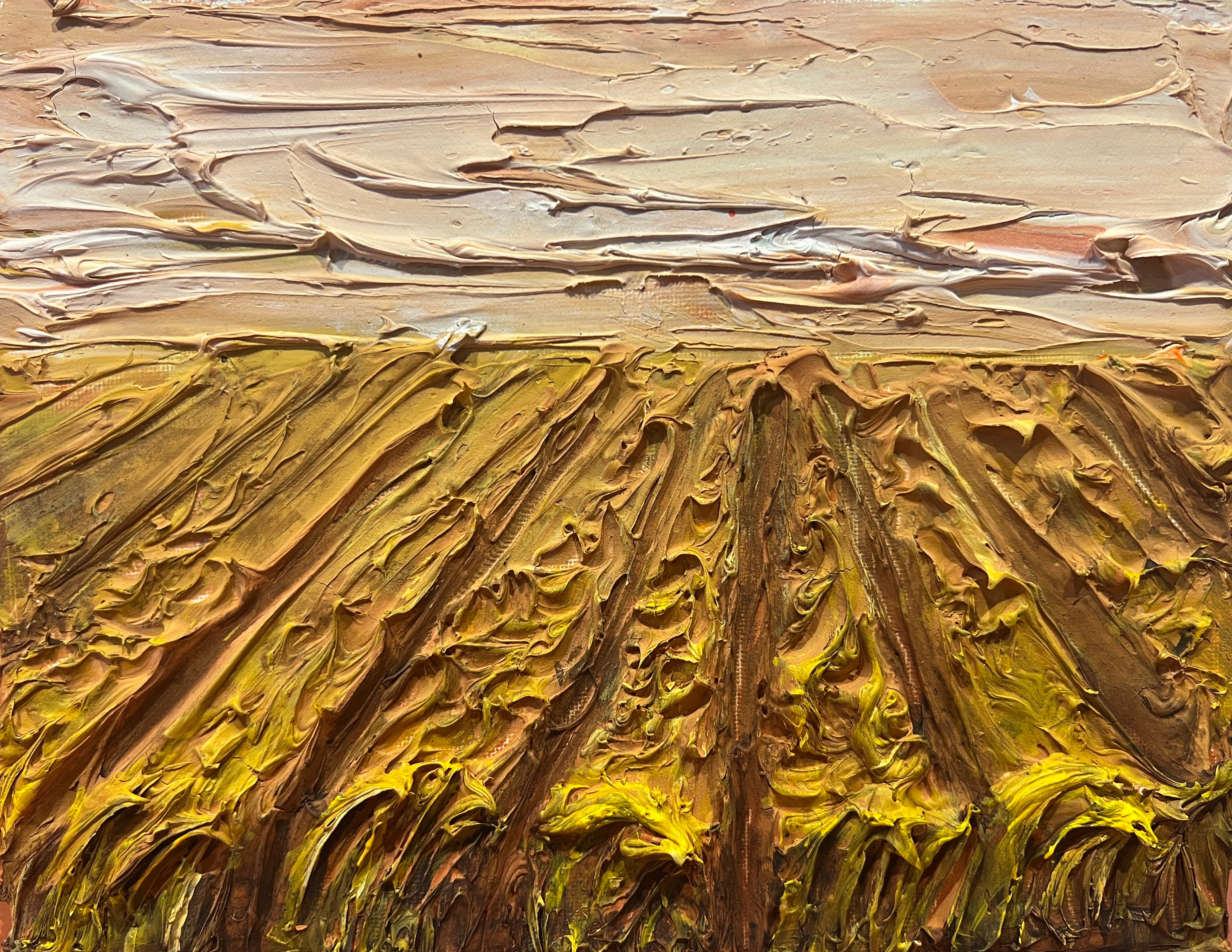 This work explores the quiet rhythm and expansive stillness of the wheat fields that surround Moree. Built up with warm texture paste, the surface holds the...