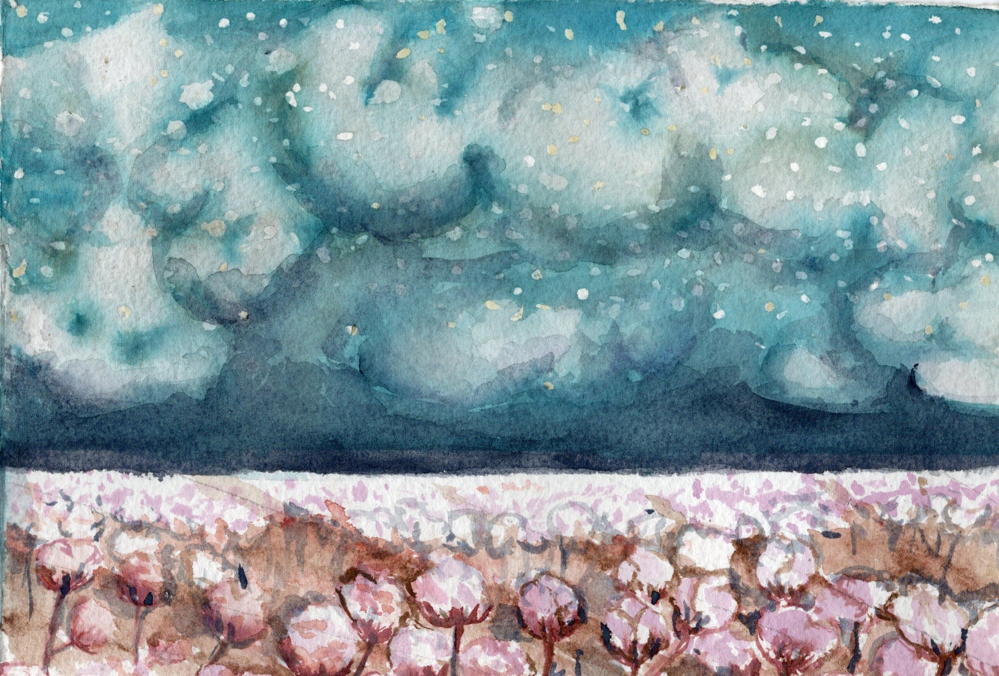 Night Time Cotton explores the landscape after dark, when colour softens and imagination takes the lead. This three-part watercolour series continues my ongoing exploration of cotton as both subject and symbol, blending the country landscape with a sense of surreal movement.