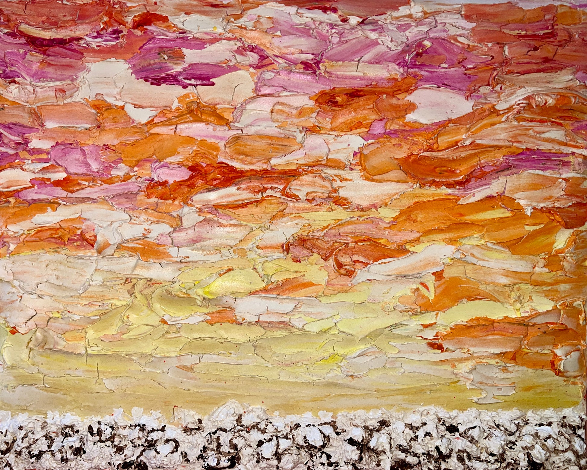 Playful pinks and shifting tonal layers act as a bridge between land and sea, softness and strength, memory and reality. Each brushstroke is a small attempt to reconcile these worlds: the pull of the tide I once knew, and the vast horizon of cotton that now surrounds me.