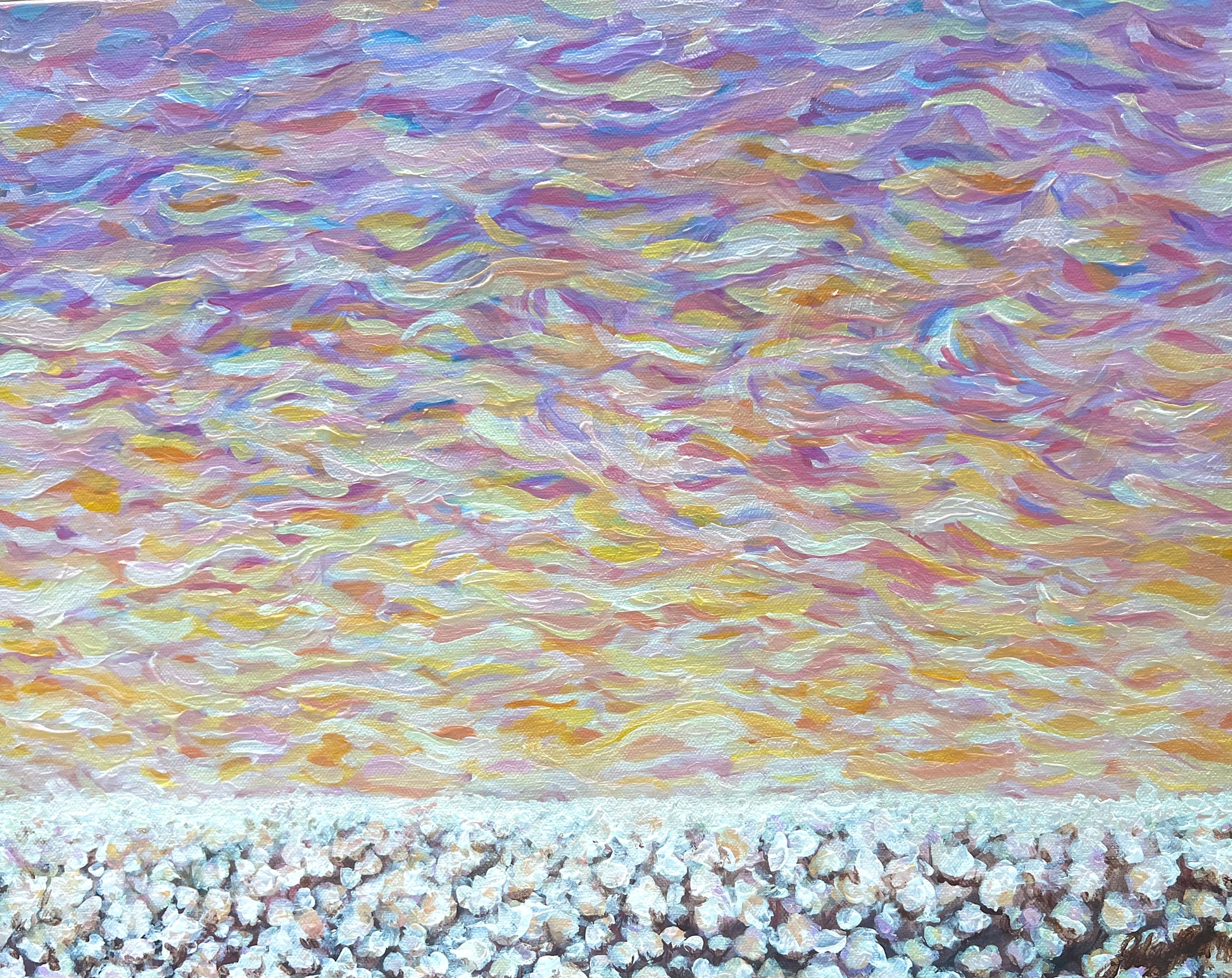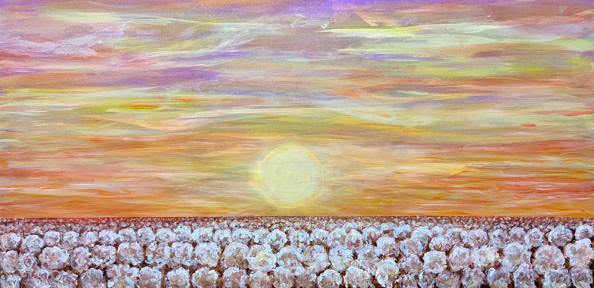 In my work, I playfully merge these contrasting environments in my mind’s eye. A roadside view of cotton in bloom becomes, to me, a seascape: fields of white transformed into the froth of low tide, shadows across the rows becoming currents pulling beneath the surface. Through colour and line, I seek to capture that sense of movement, of waves and wind, of life flowing through the land.