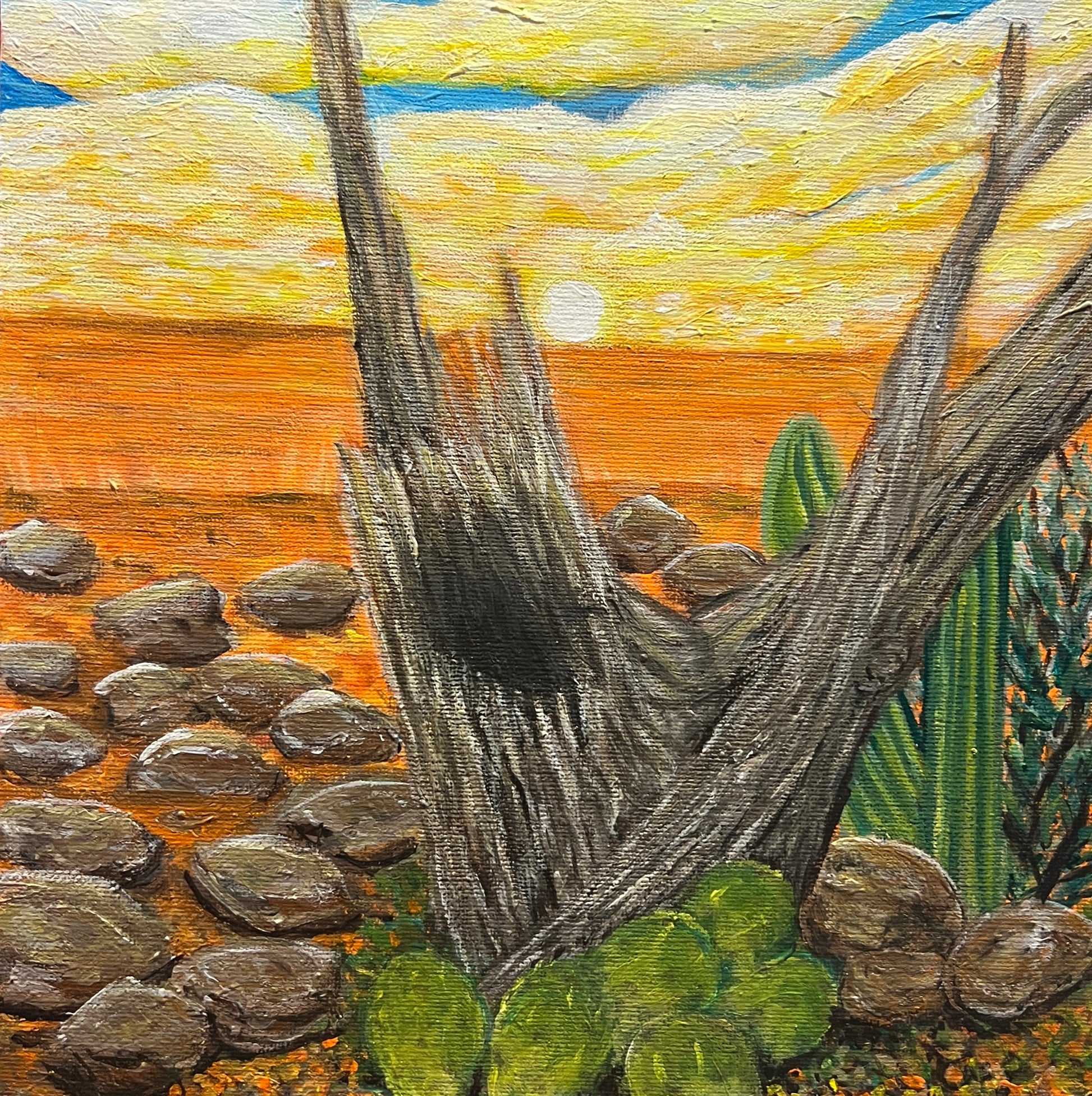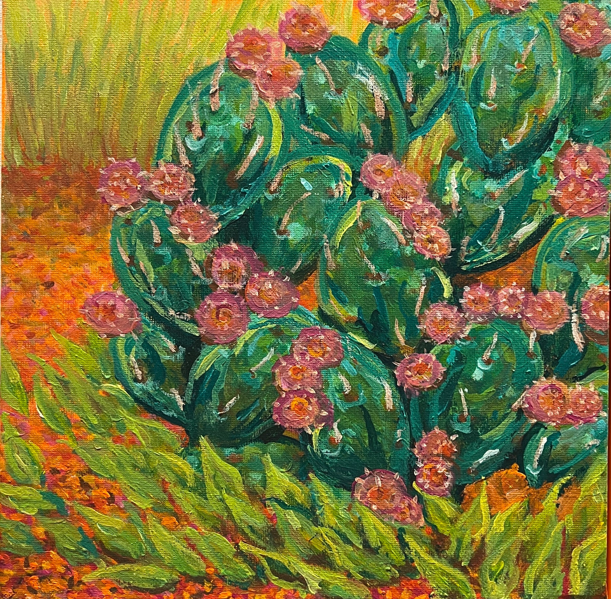 This work responds to that experience. The colours are heightened, drawing from the intensity of the red dirt, the heat shimmering across the land, and the lush bursts of life that emerge against seemingly harsh conditions. Forms intertwine and press against one another, reflecting both the toughness and softness that coexist in this environment. What might appear rugged at first glance holds moments of tenderness, growth and joy.